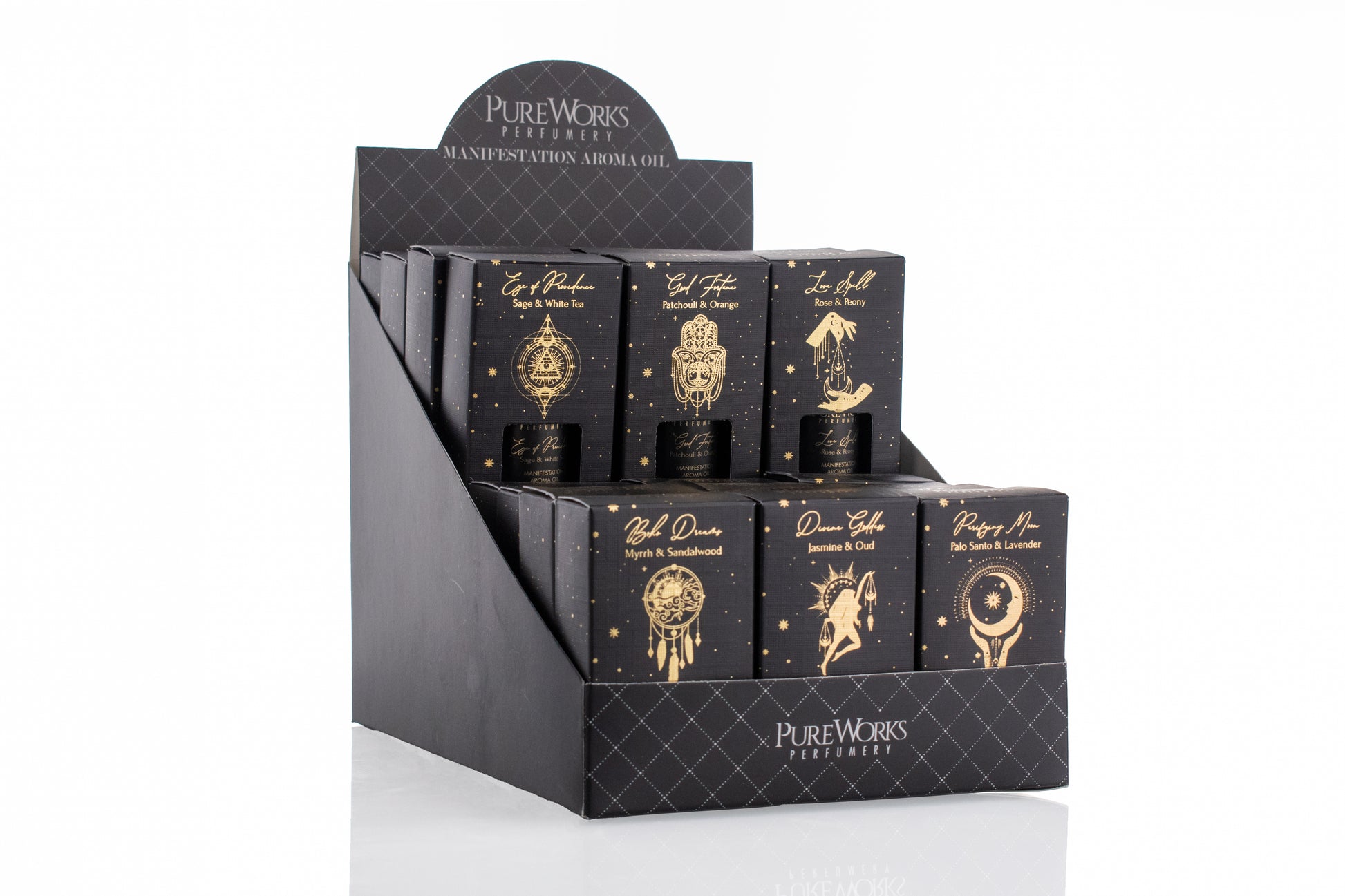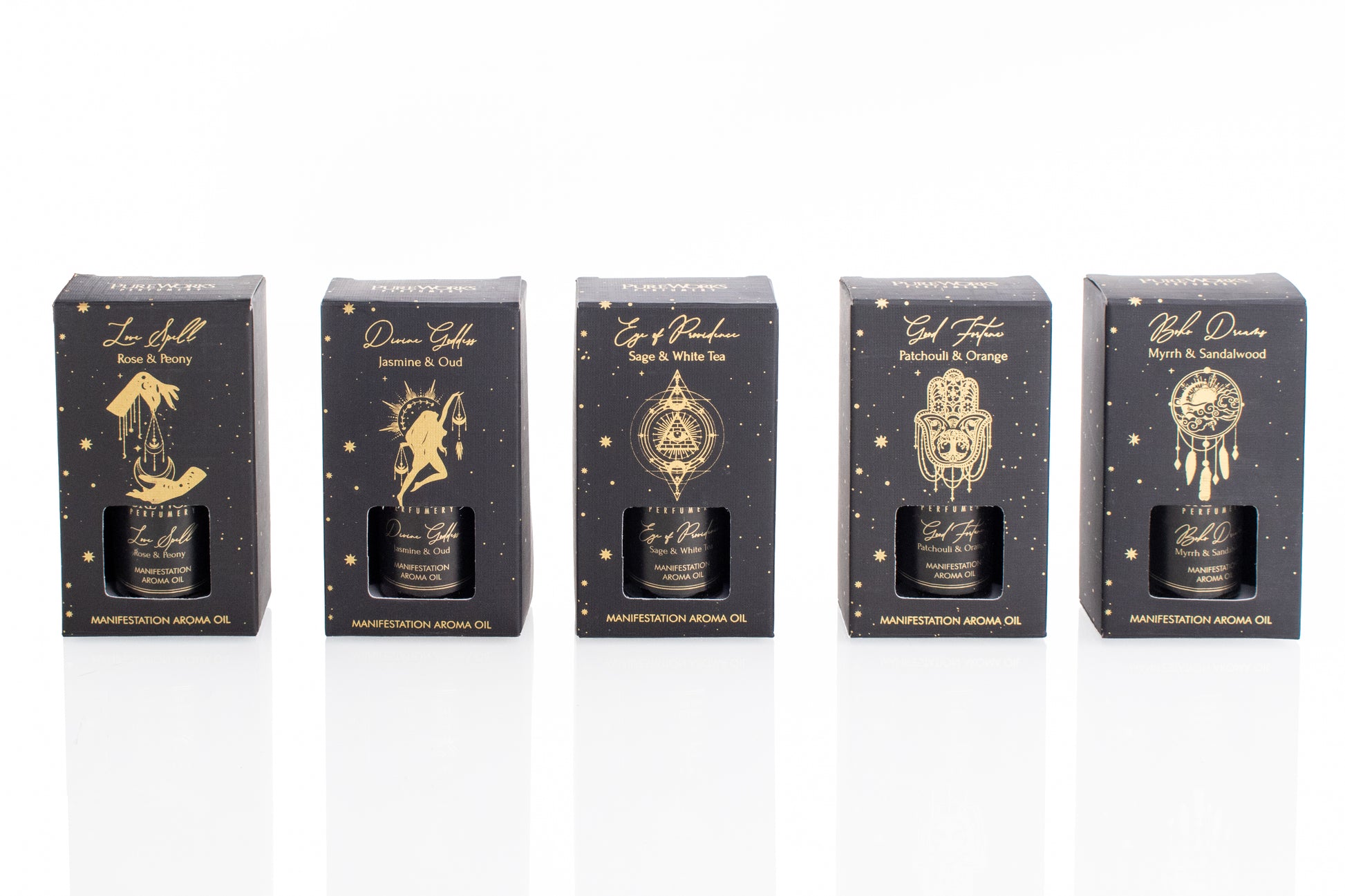 Cada mezcla ha sido formulada para un propósito energético (amor, fortuna, protección), utilizando ingredientes clásicos de la alta magia natural como el Palo Santo, la Mirra y el Oud. Presentación en caja de cartón eco-amigable con botella de vidrio y reductor de orificio para una dosificación precisa.